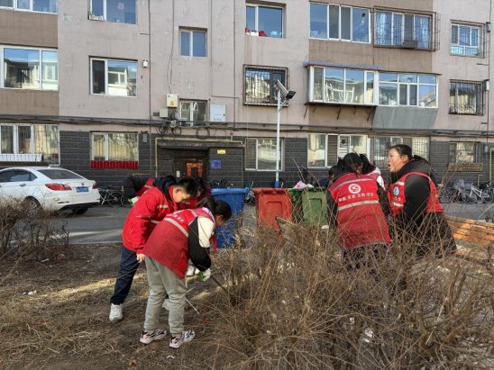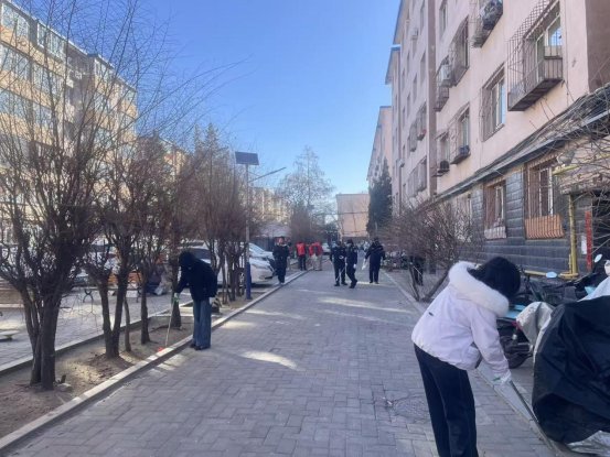 活动现场,“大手拉小手、单位联社区”的协作场景蔚为壮观。来自内蒙古工业大学的青年志愿者们化身“环境整治先锋”,认真铲除楼道墙面的违规小广告;胜利街小学的少先队员们在老师带领下,手持清洁工具对小区绿化带、公共广场的垃圾杂物进行集中清扫,用童真热情诠释志愿初心;社区党员、团员及共建单位志愿者组成“文明倡导队”,向居民宣传环保理念,引导大家共同参与家园建设。志愿者们分工协作、干劲十足,红马甲的身影穿梭在社区各个角落,成为春日里一道亮丽的风景线,用汗水让小区环境焕然一新。