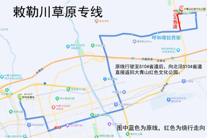 (5)敕勒川草原专线:原线行驶至S104省道后,向北沿S104省道直接返回大青山红色文化公园。双向绕行。临时取消:呼和塔拉西门,待活动结束后恢复原线运营。绕行途中逢站必停,线路图如下: