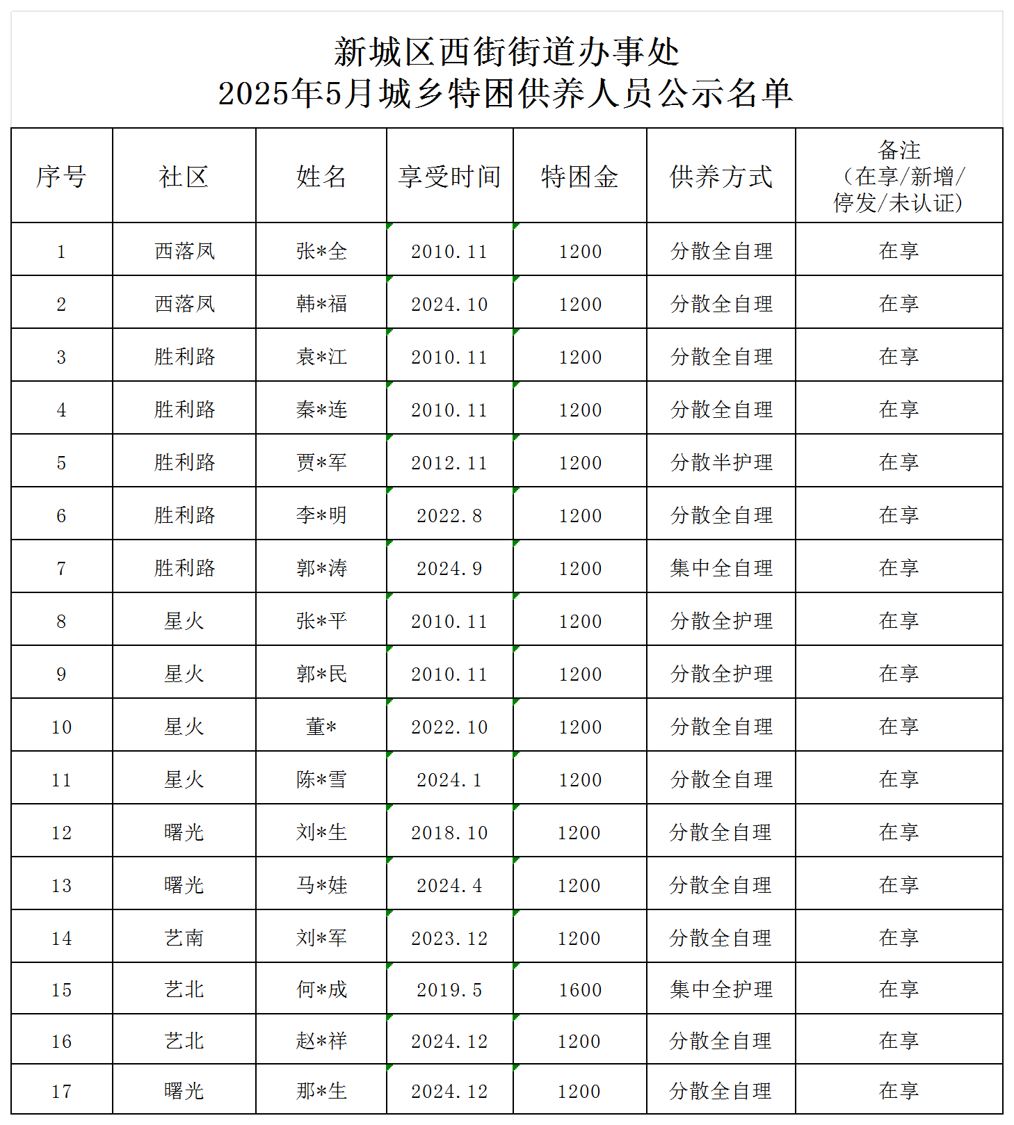 新城区西街街道办事处2025年5月城乡特困供养人员补贴发放情况