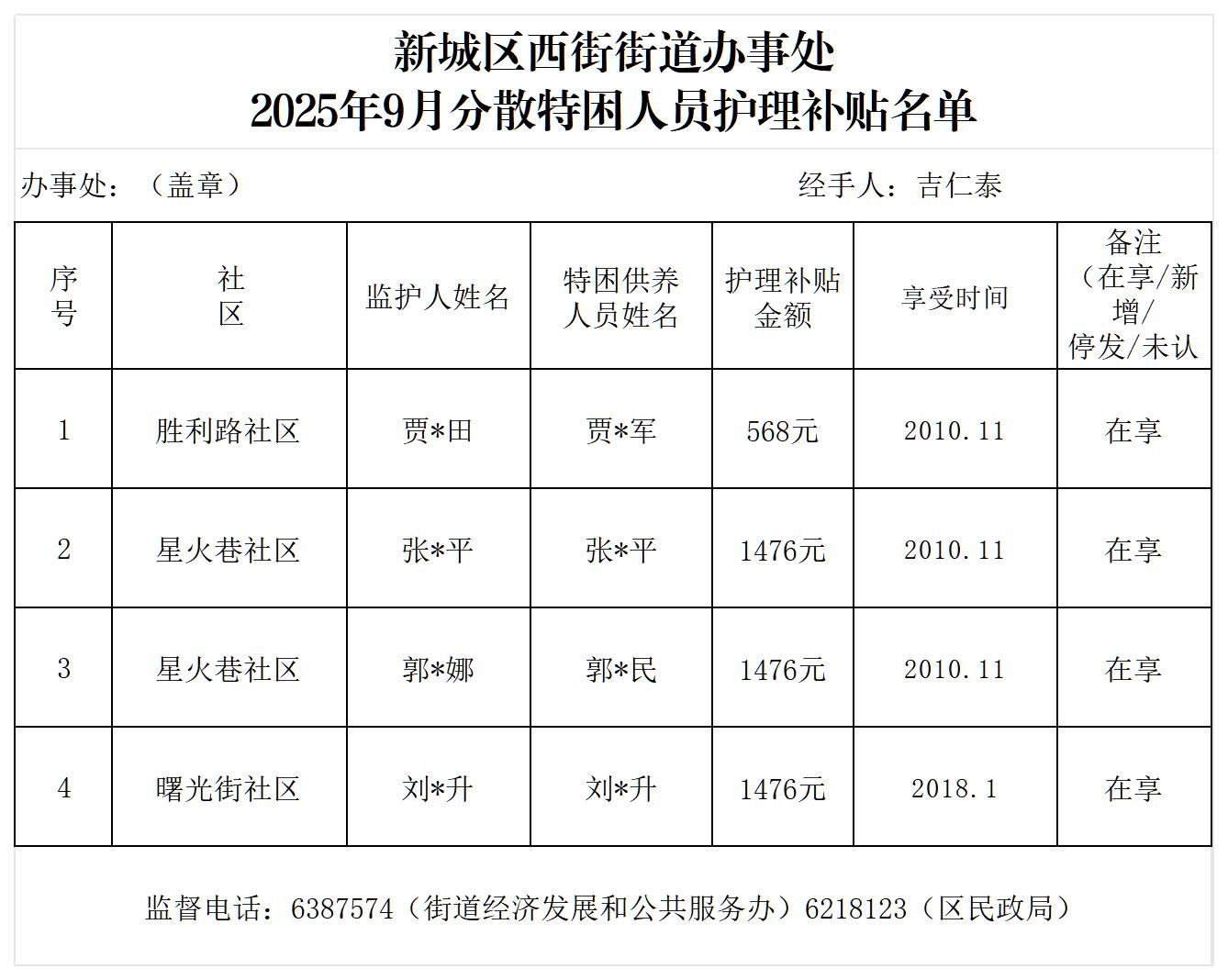 新城区西街街道办事处2025年9月分散供养特困人员护理补贴发放情况