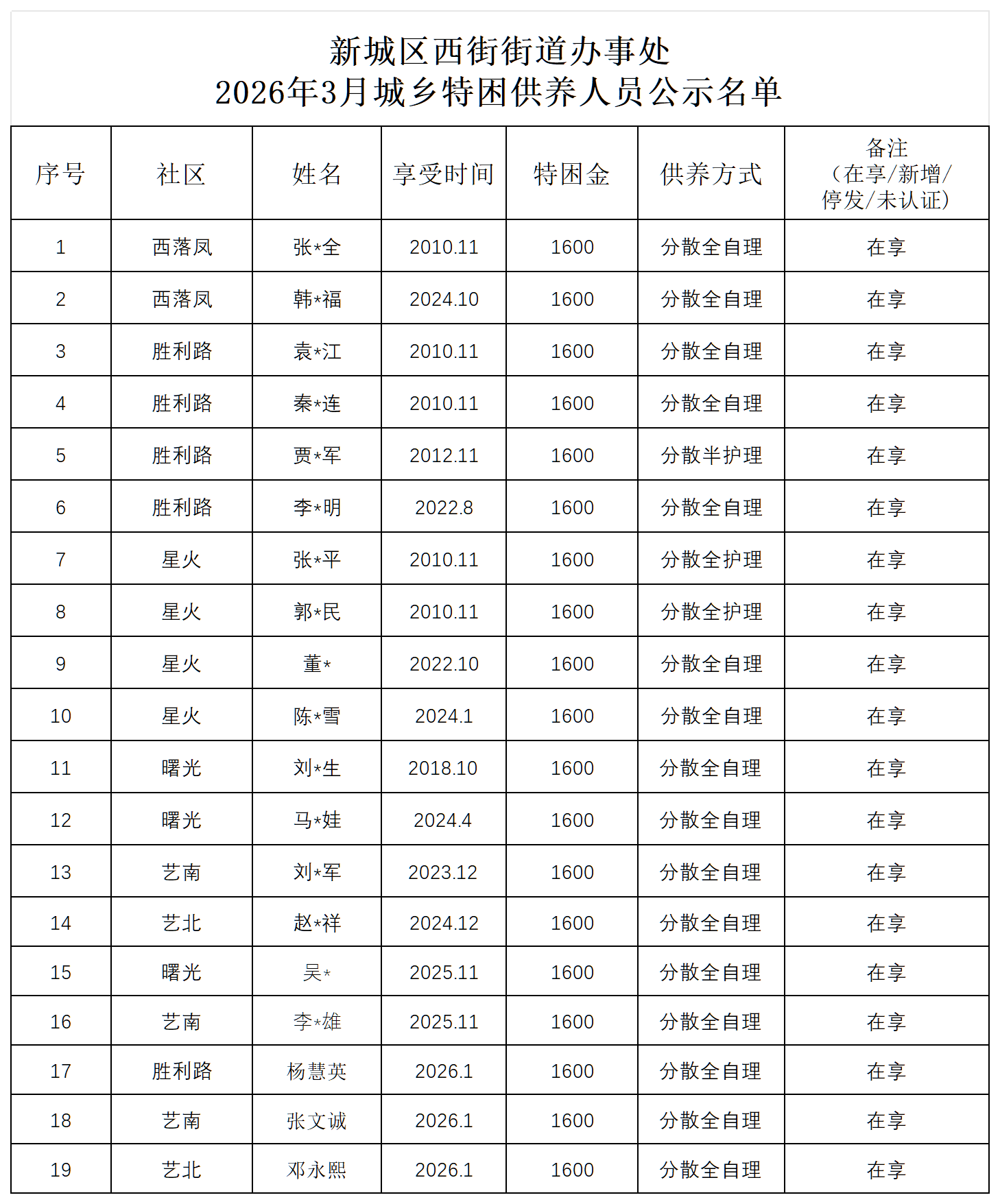 新城区西街街道办事处2026年3月城乡特困供养人员补贴发放情况
