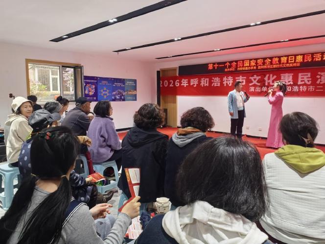 现场同步开展文艺演出。二人台歌舞小戏、经典歌曲演唱、二胡与笛子独奏等节目轮番上演,表演者将爱国情怀与安全理念巧妙融入剧情与旋律。《挂红灯》《牧民新歌》等节目精彩纷呈,既展现了地方文化特色,又让居民在欣赏艺术的同时,潜移默化地接受了国家安全警示教育。